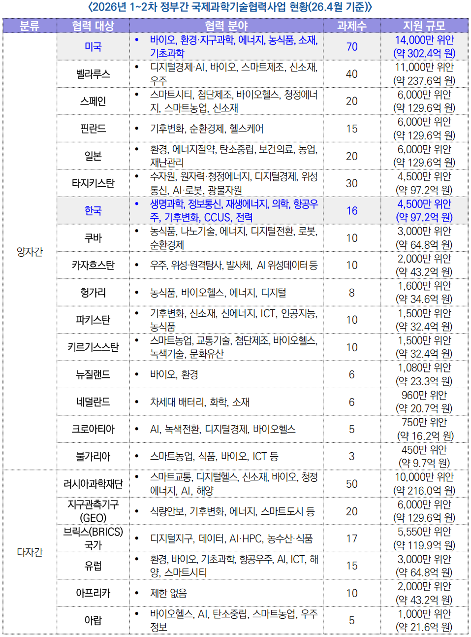 * 한국은 총 16개 과제, 4,500만 위안(약 97.2억 원)으로 예산 규모 4위 기록