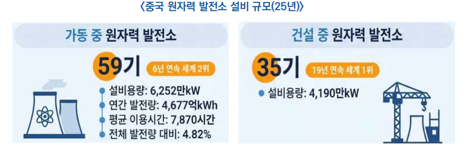 * 2025년 신규 승인된 5개 프로젝트에는 모두 민간자본이 일부 참여했으며, 원전 건설 투자액은 1,610억 위안(약 34조 원)으로 사상 최고치를 기록