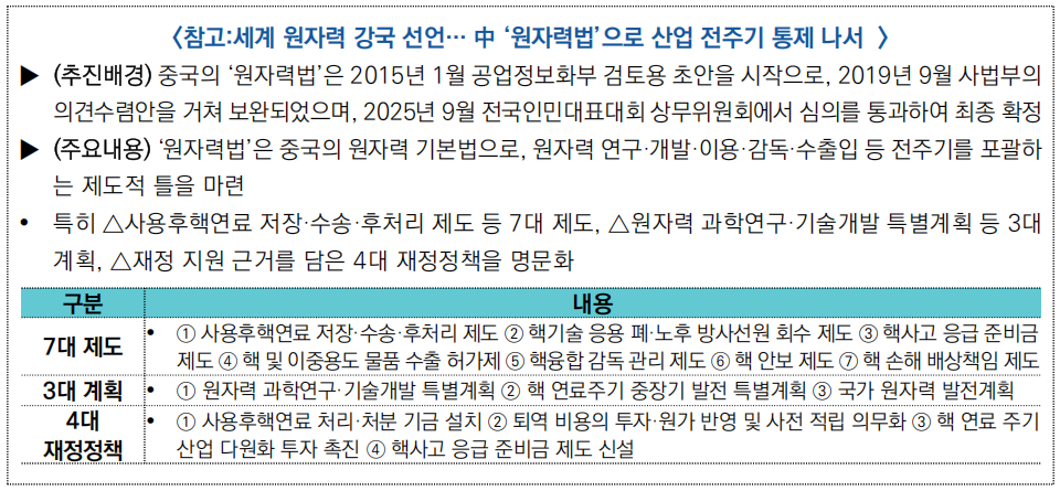 ○ (법제 정비) 중국은 2025년 「중화인민공화국 원자력법」을 통과시키고, 2026년 1월 15일부터 시행에 들어가며 원자력 산업 발전의 법적 기반을 마련