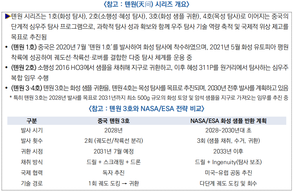 - 심우주 탐사 분야에서는 ‘톈원 2호’ 소행성 탐사·샘플 귀환 임무 착수, ‘톈원 1호’는 화성 전역 및 지역 탐사 지속해 약 3.5TB 과학 데이터 공개