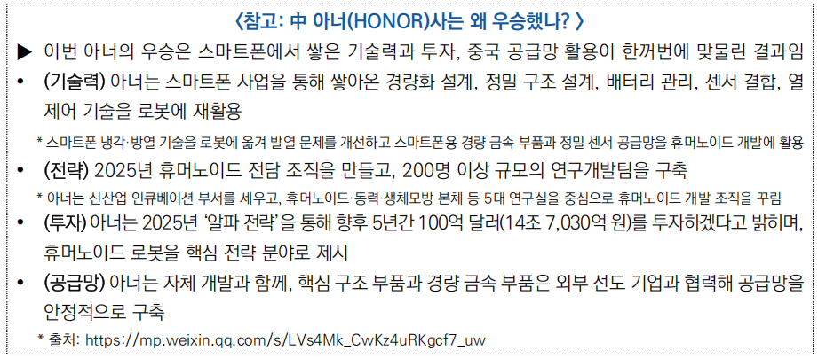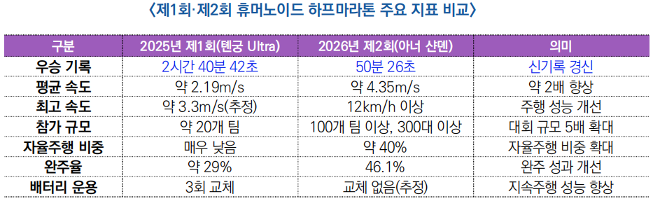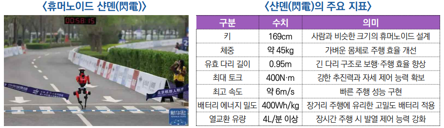 □ 26년 4월 19일 열린 제2회 휴머노이드 하프마라톤에서 아너(HONOR)의 휴머노이드 ‘샨뎬(閃電)’이 50분 26초로 참가 로봇 중 1위를 기록했으며, 인간보다 빠른 속도를 보였음