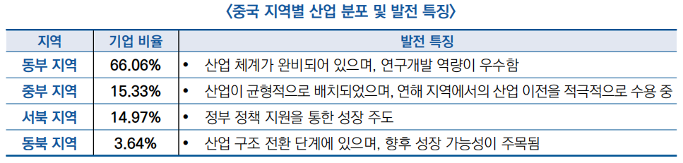 ○ (지역별) 중국 로봇 산업은 동부 지역을 중심으로 산업이 집중되고 있으나, 중부 및 서북 지역도 정책적 지원을 통해 성장 잠재력을 확대하고 있음