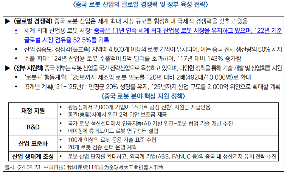 □ 중국은 11년 연속 세계 최대 산업용 로봇 시장을 형성하고 있으며, ′22년 기준 글로벌 시장 점유율 52.5%를 차지. 특히 산업 집중도와 수출 확대를 통해 국제 경쟁력을 지속적으로 강화하고 있음