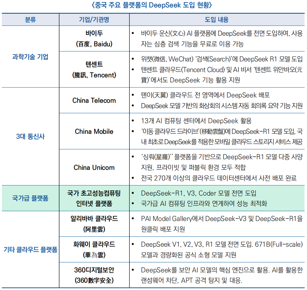 ○ 중국 내 주요 IT 기업, 통신사, 국가 인프라, 클라우드 서비스 제공업체가 DeepSeek를 도입하여 AI 검색, 클라우드 컴퓨팅, 영상회의, 보안 등 다양한 분야에서 활용을 확대하고 있음