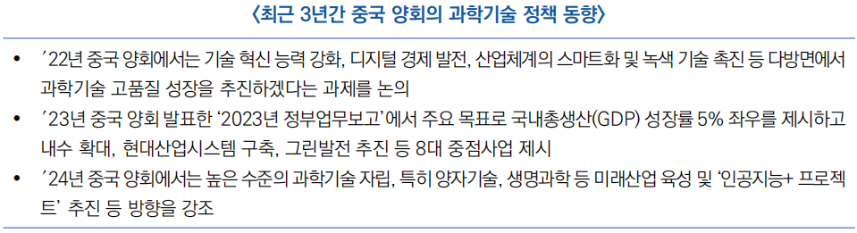 ○ 최근 3년간 중국 양회는 과학기술 발전의 주요 정책 플랫폼으로서 핵심 역할을 수행하며, 국가 차원의 기술 혁신 방향을 제시