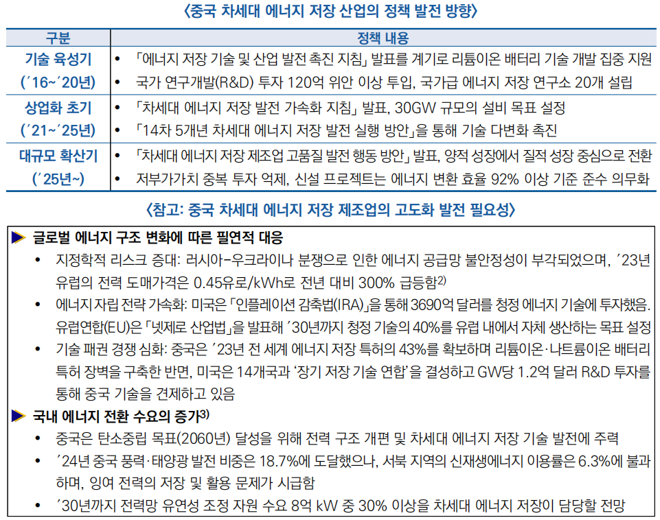 □ (배경) 글로벌 에너지 구조가 급격히 변화하고 탄소중립 목표 달성이 가속화되는 가운데, 차세대 에너지 저장 제조업은 중국이 에너지 전환을 실현하고, 에너지 안보를 강화하며, 국제 경쟁력을 제고하기 위한 핵심 산업으로 자리 잡고 있음