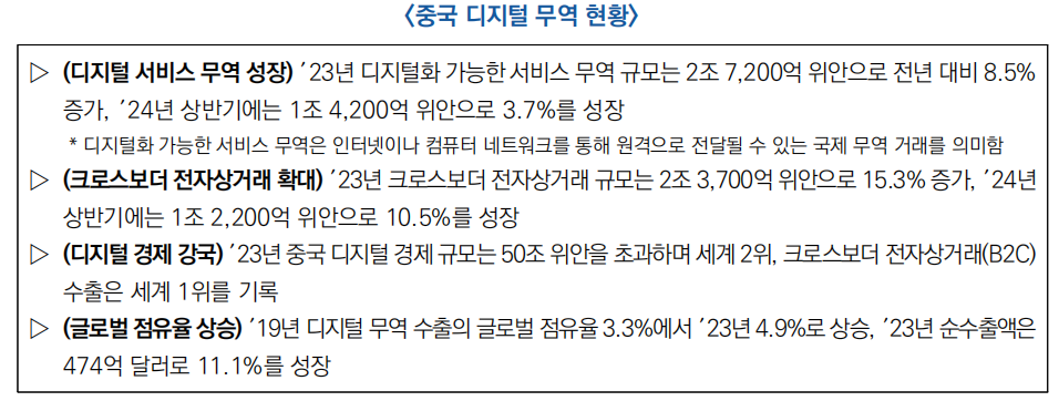 ○ ′23년 중국 디지털 경제 규모는 50조 위안을 초과하며 세계 2위, 크로스보더 전자상거래(B2C) 수출은 세계 1위를 기록