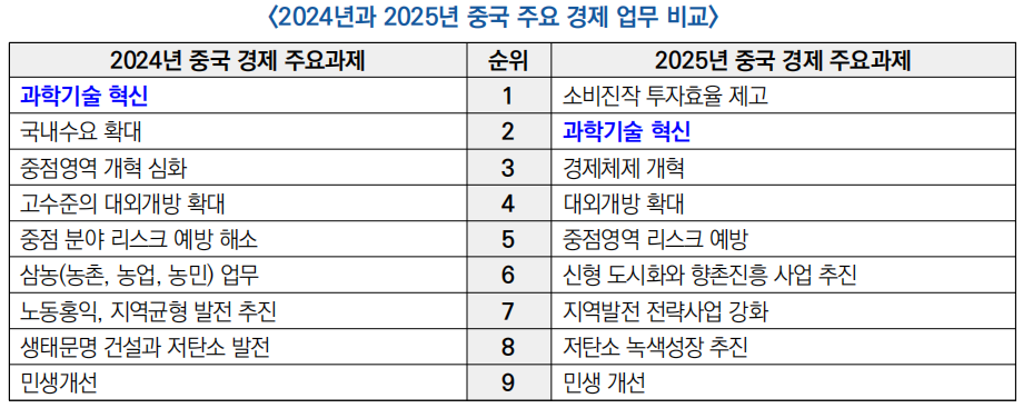 - (순위 변화) 2025년 중국 경제 업무의 최우선 과제로 소비 진작을 제시하고 지난해 회의서 첫째 순위로 설정했던 과학기술 혁신은 소비 진작에 밀려 두 번째로 언급
