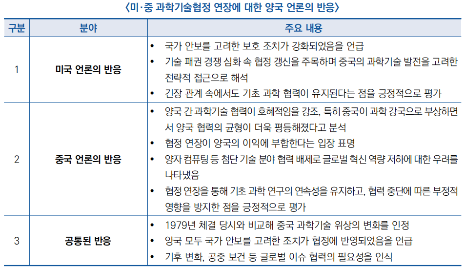 ![]() □ (양국 언론 반응) 미국의 Yahoo와 Nature, 중국의 신화망(新華網) 등 주요 언론에 따르면, 양국은 기초 연구 협력의 중요성과 지정학적 경쟁 속 제한적 협력의 필요성을 인정했으며, 미국이 국가 안보와 협정 축소를 강조한 반면, 중국은 협력의 지속성과 호혜성을 부각