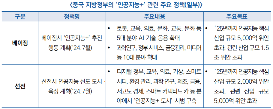 - ‘인공지능 플러스’는 AI 기술을 전통 산업과 심층적으로 융합하는 것을 목표로 생산성을 향상시키고, 자원 배분을 최적화하며, 새로운 경제 성장 동력을 발굴하는 데 중점을 둠