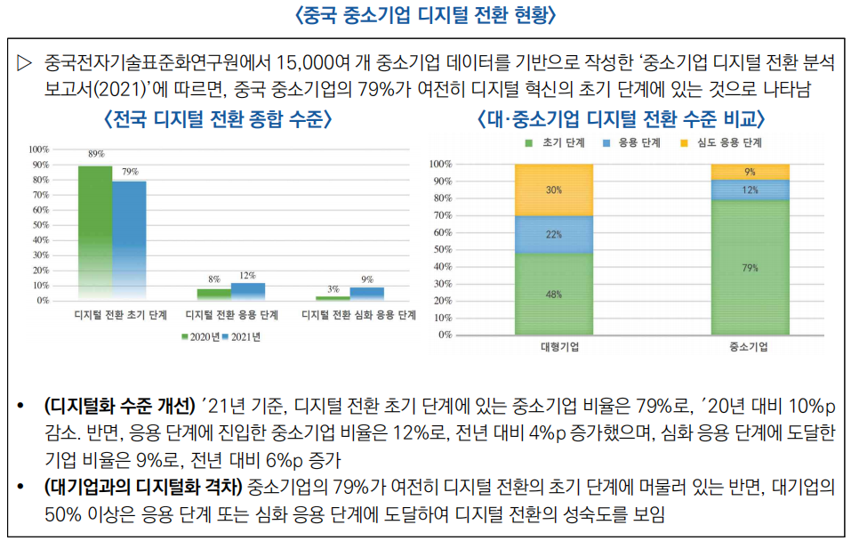 ○ 현재까지 66개 시범 도시 선정, 196개 우수 사례 발굴, 24만 개 기업의 디지털 자가 평가 지원, 1만 2천 회 행사 개최 등을 통해 디지털 전환의 속도와 품질이 개선되었으나, 중국 중소기업의 79%가 여전히 디지털 혁신의 초기 단계에 있는 것으로 나타남