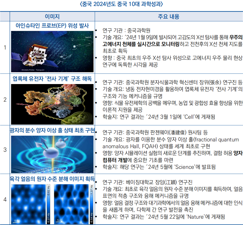 □ 과기일보(科技日報)는 우주과학, 양자물리, 정보기술 등 다양한 분야에서 ‘2024년 중국 10대 과학성과’를 선정(24.12.23)