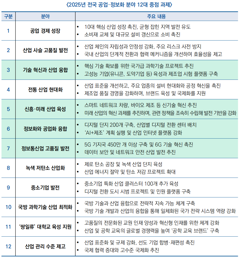 ![]() ○ (2025년 과제) 이번 회의에서는 ‘공업 경제 성장’, ‘산업 사슬의 고품질 발전’, ‘기술 혁신과 산업 융합’, ‘전통 산업의 현대화’, ‘신흥·미래 산업 육성’을 포함한 12대 중점 과제를 제시