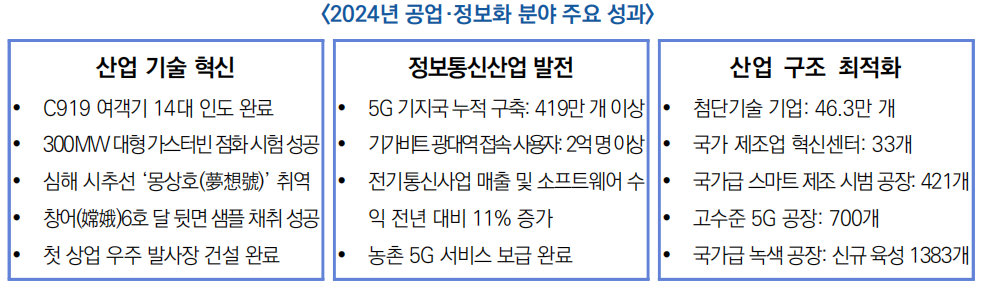 ○ (2024년 성과) 중국 전체 공업·정보화 분야는 규모 이상 공업 증가율이 전년 대비 5.7% 상승, 국가 산·금융 협력 플랫폼을 통해 기업에 지원된 자금은 1조 위안(약 199조 3,600억 원)을 초과