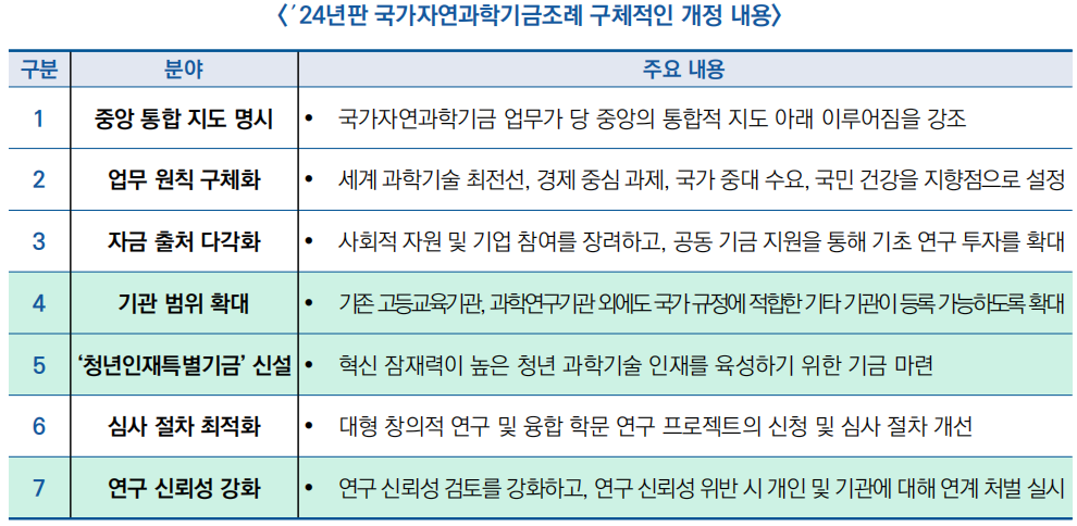 ○ (목표) 이번 개정은 과학 기금 사용과 관리의 효율성을 높이며, 기초 연구와 인재 양성을 지원함으로써 고도의 과학기술 자립과 자강을 실현하는 것을 목표로 하고 있음