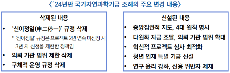 ![]() ○ (혁신) 국가자연과학기금 조례 개정에서는 ‘기관 범위 확대’, ‘청년인재특별기금 신설’, ‘연구 신뢰성 강화’ 등 내용을 강조