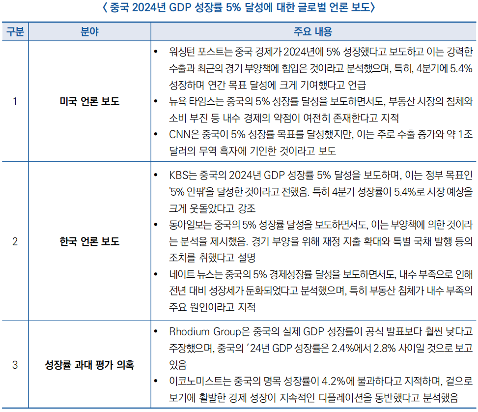 ![]() □ (글로벌 언론) 한편, 미국의 CNN과 한국의 KBS 등 해외 주요 언론사는 중국 경제의 5% 성장률 달성을 보도하면서도, 이면의 부동산 침체와 내수 부진과 같은 경제적 문제점들을 함께 지적했음. 또한, GDP 5% 성장에 대해 의문을 제기하는 해외 보도들도 있음