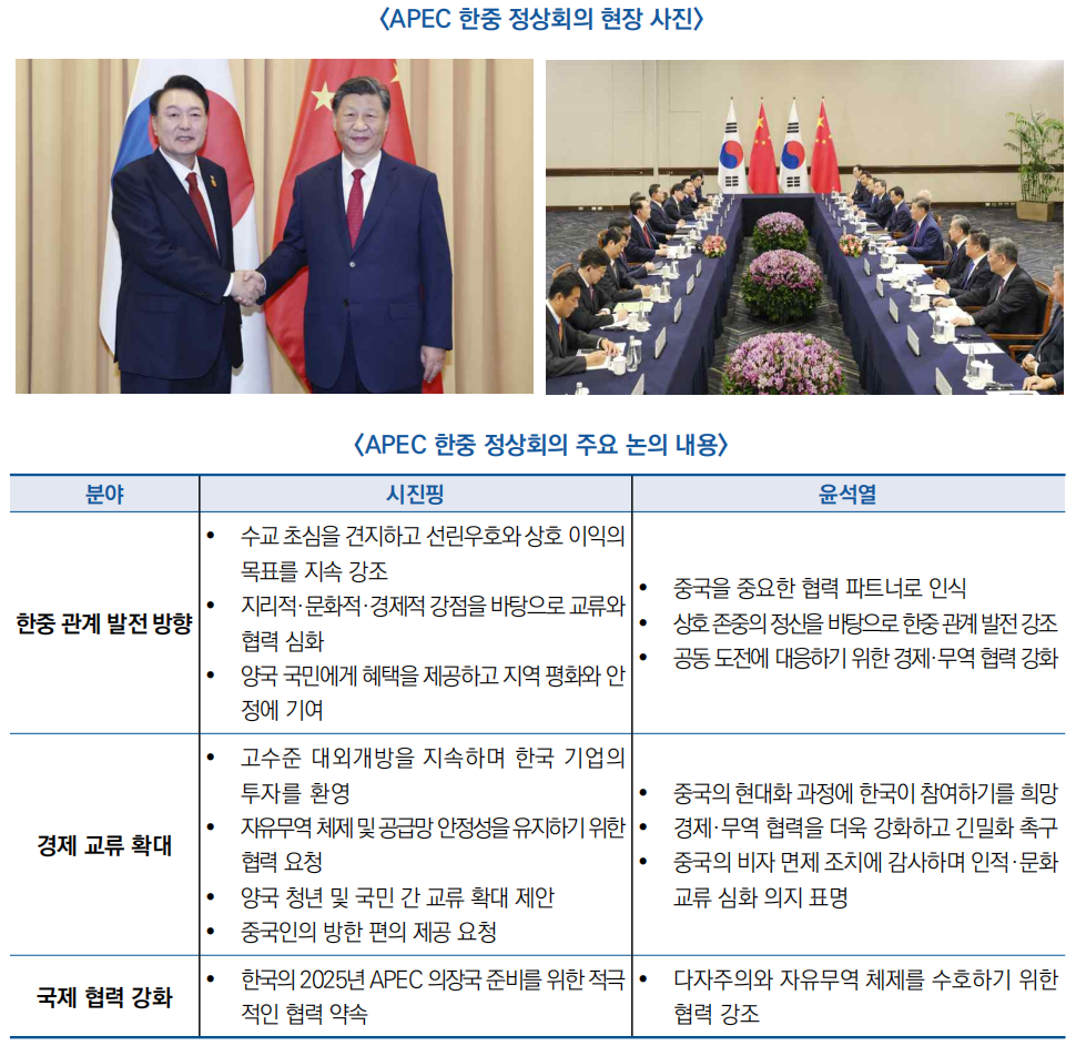○ APEC 정상회의를 계기로 시진핑 주석과 윤석열 대통령이 2년 만에 정상회담을 갖고, 양국 간 협력 강화를 위한 심도 있는 논의를 진행