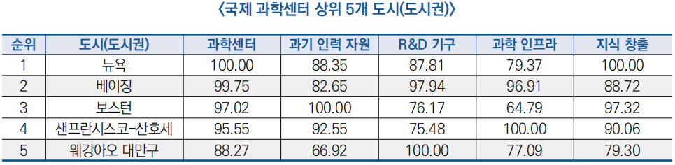 - 미국은 뉴욕(1위), 보스턴(3위), 샌프란시스코-산호세(4위)로 과학센터 분야를 선도하며, 베이징(2위)과 웨강아오 대만구(5위)가 그 뒤를 이었음