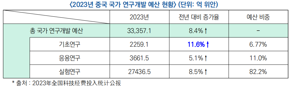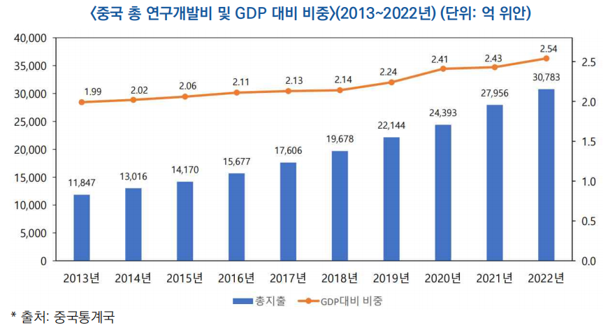 - ′23년 국가 총 연구개발비 규모는 3조 3,357억 1,000만 위안(약 640조 원)으로, ′22년 대비 8.4% 증가한 수치로, 미국에 이어 글로벌 2위를 기록