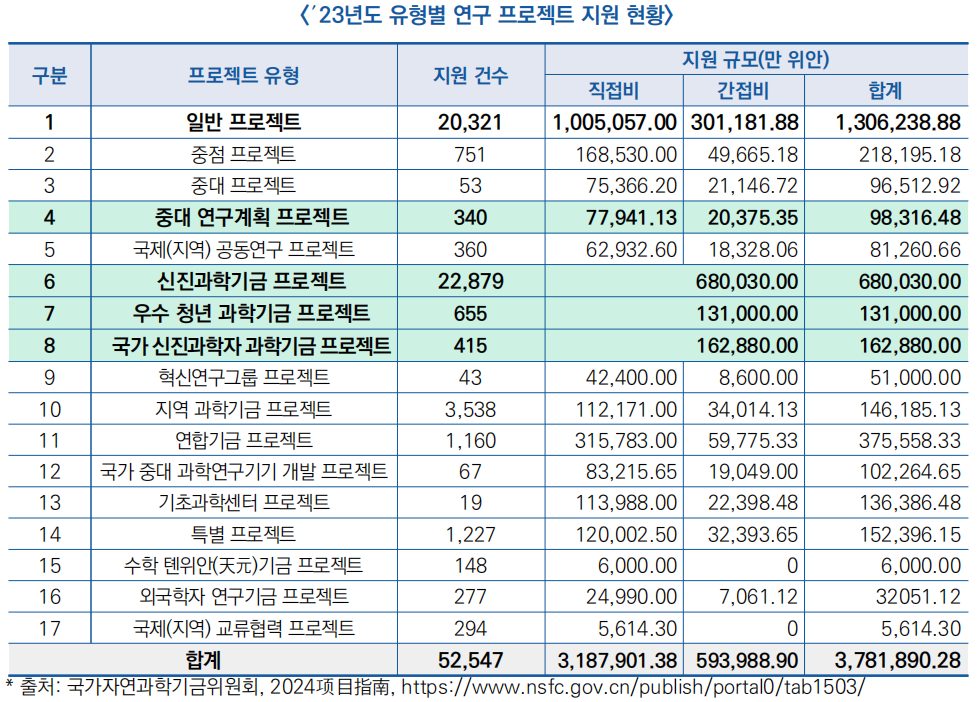- ′23년 국가자연과학기금위원회(NSFC)는 총 52,547건의 연구과제를 대상으로 약 378억 위안(7조 1,423억 원)을 지원하고 그중 직접비와 간접비는 각각 약 319억 위안과 59억 위안임