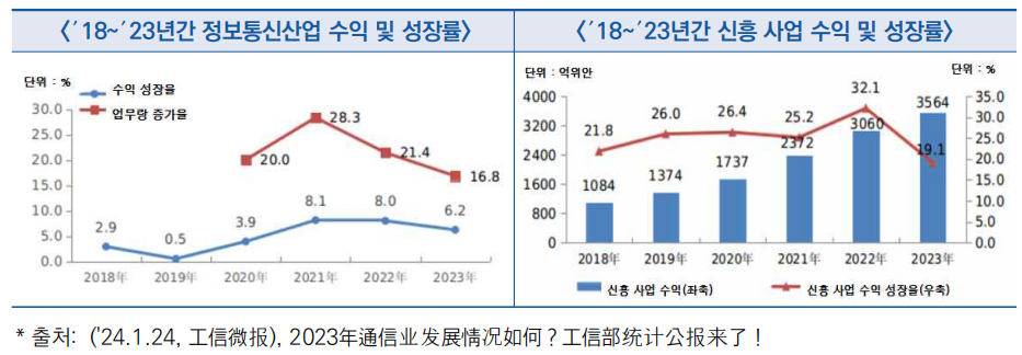 ○ ′23년 정보통신산업 분야 수익은 1.68조 위안으로 전년 대비 6.2% 성장, 이중 모바일 인터넷, 고정 광대역 접속, 클라우드컴퓨팅 등 3대 신흥 사업의 전체 수익 대비 비중은 37.8%, 15.6%, 21.2%를 각각 차지, 특히 클라우드 및 빅데이터 수익은 전년대비 37.5% 성장