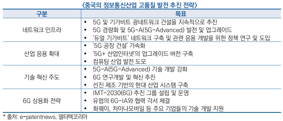 □ (정책) 중국은 향후 5G-A 업그레이드, 6G 연구, 듀얼 기가비트 네트워크 및 산업인터넷 발전 등을 통해 정보통신산업의 고품질 발전을 촉진할 예정