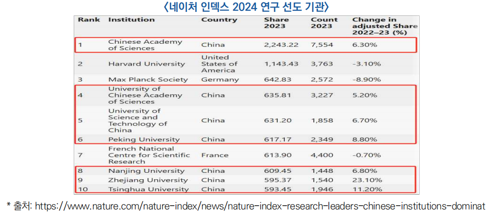 ![]() ○ 2024년 Nature Index Research Leaders에서 자연과학 및 의학 분야 고품질 논문 발표 기준 상위 10위권 내에 중국과학원(CAS), 중국과학기술대학 등 7개 중국 기관이 포함됨