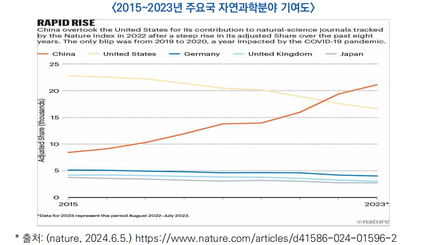○ 세계 3대 저널인 「네이처」의 ‘2022년 자연과학 분야 저널 국가별 점유율’에서 중국이 2021년 대비 21% 이상 급상승해 처음으로 미국을 추월함