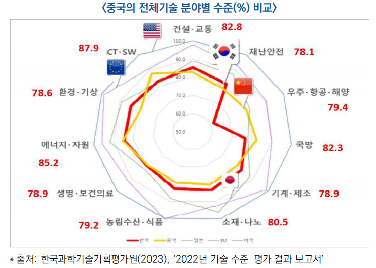 ![]() □ (기술) 과기정통부의 2022년 국가별 기술 수준 평가에서는 최고 기술 보유국인 미국을 100%로 봤을 때 유럽연합(EU) 94.7%, 일본 84.6%, 중국 82.6%, 한국 81.5% 순위로 '20년 대비 한중이 역전됨