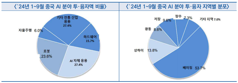 ![]() ○ (투자 현황) ′24년 1~3분기 동안 중국에서 발생한 AI 관련 투자 및 금융 조달 건수는 총 504건이며, 투자 금액은 약 812억 위안에 달함