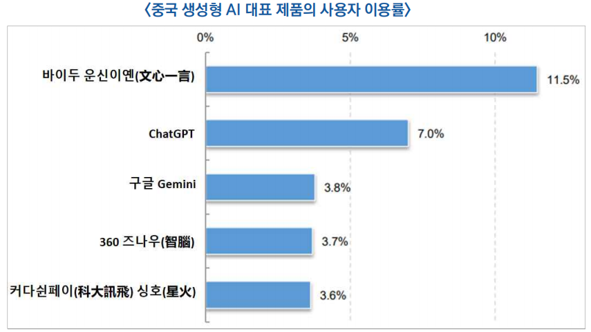 - 바이두의 운신이옌(文心一言), 360의 즈나우(智腦) 등 중국산 생성형 AI 제품은 사용자층에서 광범위하게 활용되고 있으며, OpenAI와 구글 등 해외 기업의 제품 또한 일정한 사용자를 확보하고 있음