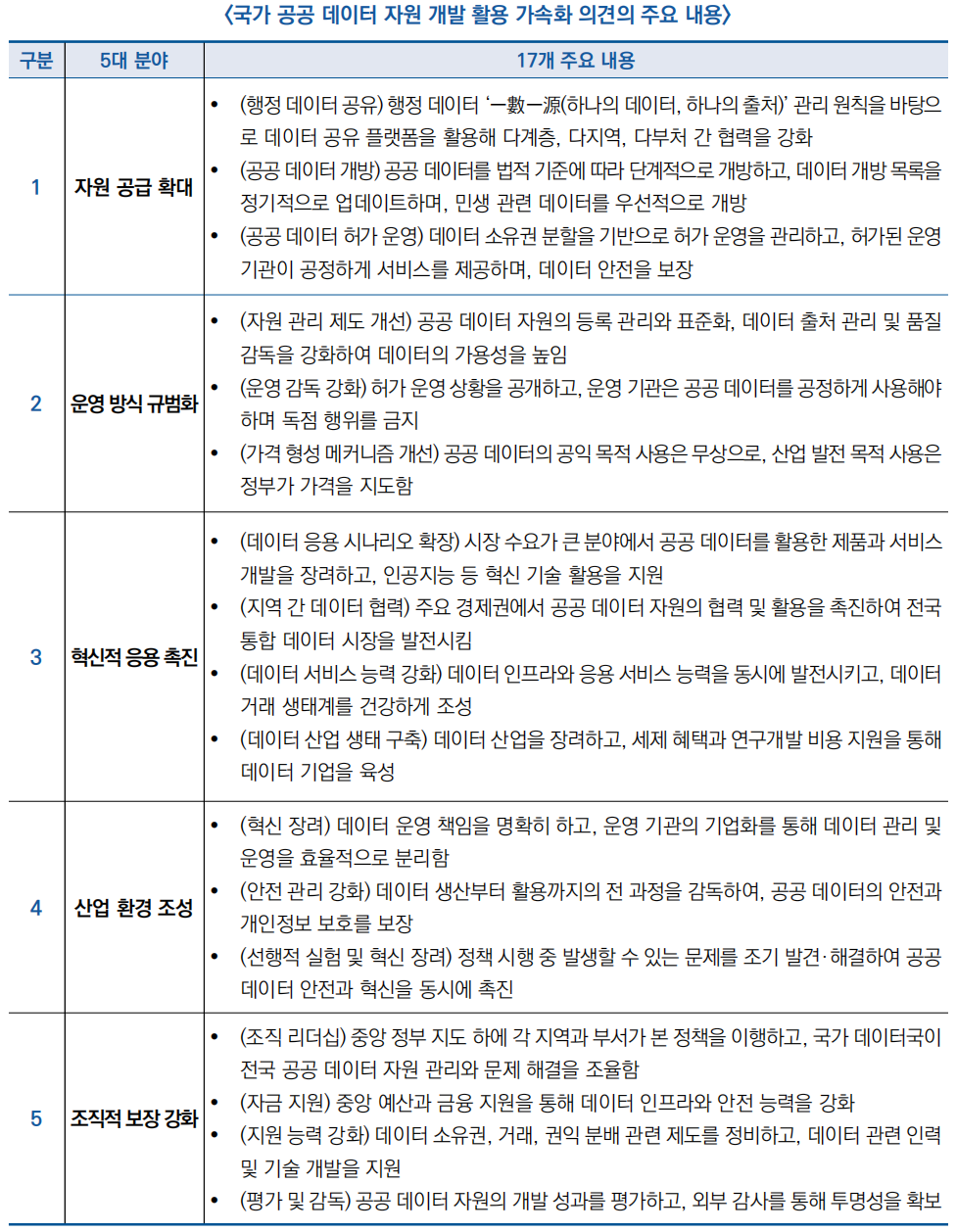 ○ (내용) ‘의견’서는 공공 데이터 유통 및 사용을 가로막는 체제적 장애물과 제도적 문제를 해결하는 데 중점을 두고 있으며, 발전과 안전의 균형, 효율성과 공정성의 조화를 목표로 5대 분야에서 17개의 구체적인 조치를 제안