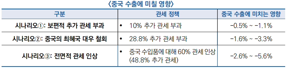 ![]() ○ 화창증권은 트럼프 관세 정책이 중국 수출에 미치는 영향을 평가하기 위해 3가지 점재적인 관세 시나리오를 가정하였으며 외삽법을 통해 각 시나리오가 중국 수출에 미칠 영향을 추정