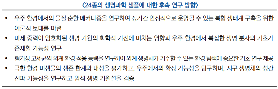 ○ 회수된 샘플은 우주 생명과학, 우주 재료과학, 미세 중력 연소과학 등 28건의 과학 실험 프로젝트와 관련이 있으며, 후속 연구는 다음과 같은 방향에서 구체화될 예정