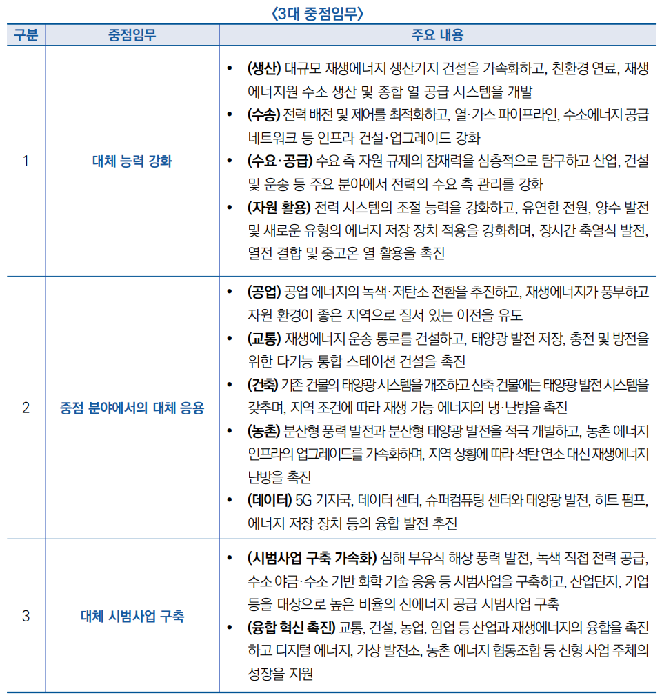 ○ 주요 내용으로 재생에너지 대체 능력 강화, 중점 분야에서의 대체 응용, 대체 시범사업 구축 등 3대 분야 중점임무를 제시