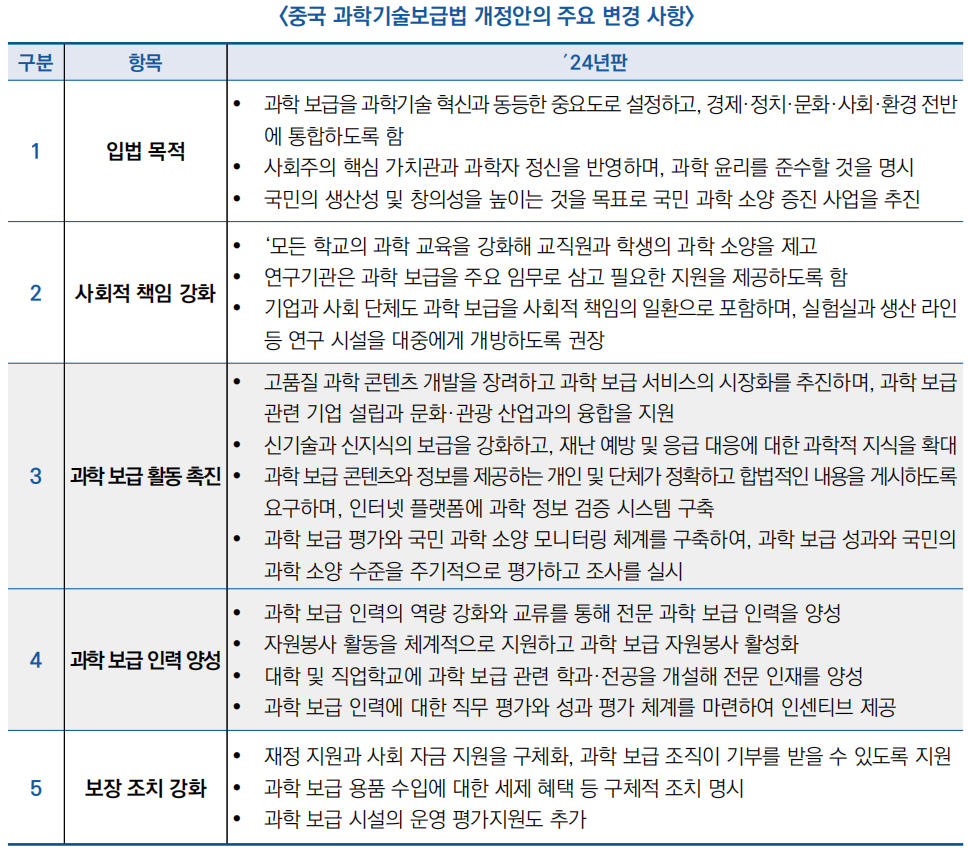 □ ‘중국 과학기술보급법 개정안’은 ′02년 제정 이후 처음으로 전국인민대표대회 상무위원회에 개정안 심의를 상정함(24.11.4)