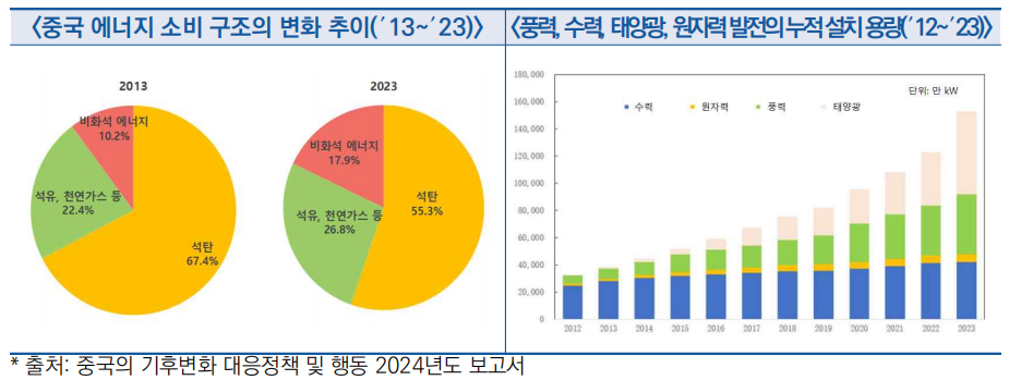 - ′23년 중국의 전체 에너지 소비에서 비화석 에너지가 차지하는 비중은 17.9%로 증가