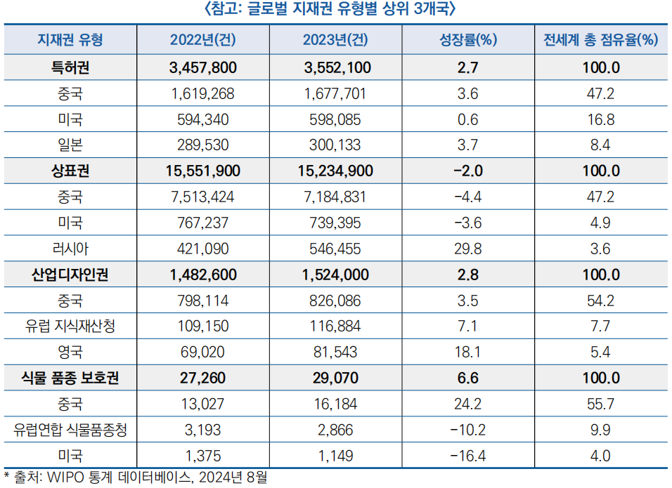 - 중국은 약 82만 건으로 전 세계 절반 이상(54.2%)을 차지해, 유럽 지식재산청(EUIPO)과 영국이 각각 7.7%, 5.4% 차지