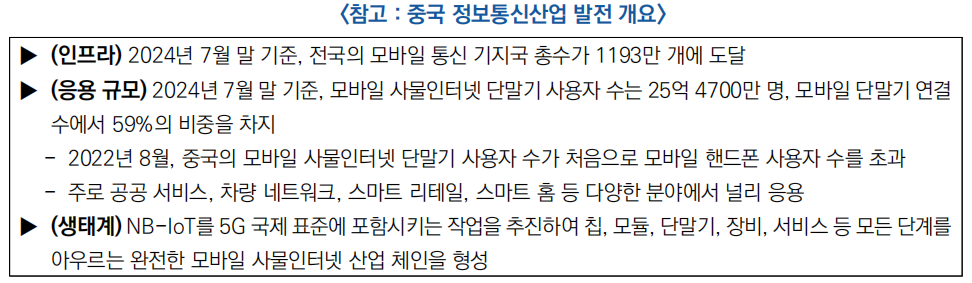 ○ 중국 공산당 중앙위원회와 국무원이 공동 발표한 ‘디지털 중국 건설의 전체적 배치 계획’(′23.2월)에서는 "모바일 사물인터넷*의 전면적인 발전을 추진한다"는 명확한 목표를 제시함