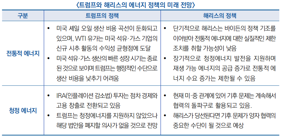 ○ 현재 미국 대선 과정에서 트럼프와 해리스 후보의 에너지 정책은 명확한 차이를 보이고 있으며, 이는 미국의 전통적 에너지 및 청정에너지 산업에 직접적인 영향을 미칠 것으로 예상
