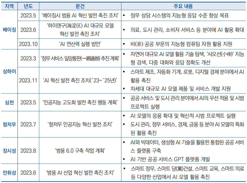 ![]() □ 중국 베이징, 상하이, 항저우, 심천 등 주요 지방 부처를 중심으로, 정무 핫라인, 스마트 고객 서비스, 도시 관리, 의료, 교육 등 분야에서 대규모 AI 모델의 활용을 촉진하기 위한 다양한 정책을 발표