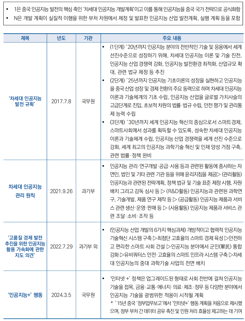 ![]() □ 중국은 인공지능 발전을 위한 정책기반과 제도적 보장 체계를 구축하기 위해 ‘1+N’ 정책구조를 마련