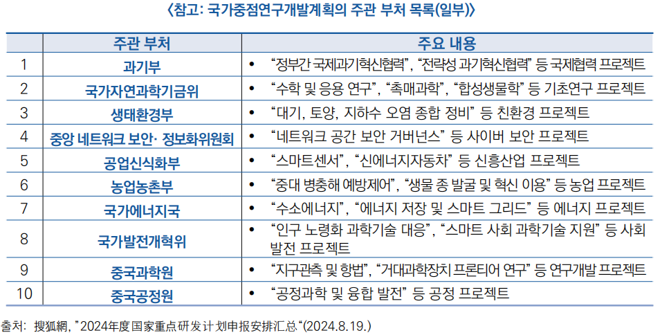 ○ 과기부와 재정부 공동으로 「국가중점연구개발계획 관리 임시 방법」(24.3월)을 발표해 국가중점연구개발계획의 주관 기관을 기존의 과기부에서 자연과학기금위, 생태환경부, 국가에너지국 등 아래 표와 같이 다양한 부처로 분산시킴