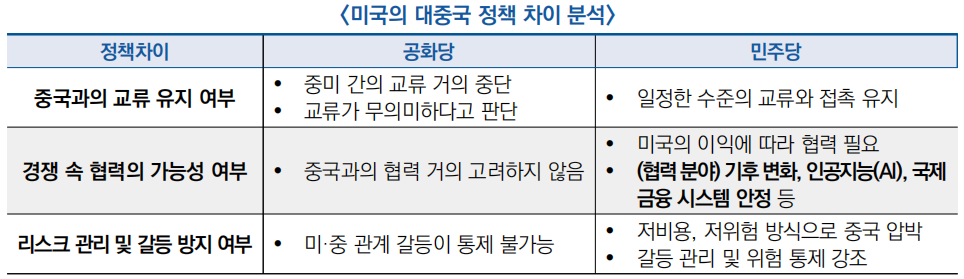 ○ 트럼프와 바이든 행정부는 모두 중국을 미국의 주요 전략적 경쟁자로 인식하고 있으며, 중국에 대한 억제와 압박 정책을 추진 중