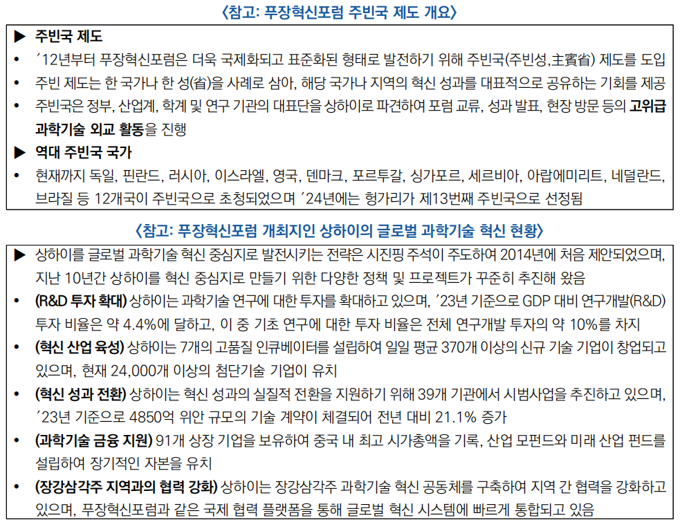 □ ‘2024년 푸장혁신포럼(浦江創新論壇)’은 ‘공유와 혁신, 함께 만들어 나가는 미래: 기술 혁신 개방 환경 구축’을 주제로 9월 7일부터 10일까지 상하이에서 개최될 예정(24.8.30)