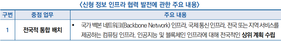 * 신형 정보 인프라: 5G 네트워크, 광대역 광섬유 네트워크, 백본 네트워크(Backbone Network), 국제 통신망, 위성 인터넷 등 다양한 네트워크 인프라를 아우르며, 데이터센터, 범용 계산력 센터, 지능형 컴퓨팅 센터, 슈퍼컴퓨팅 센터와 같은 컴퓨팅 인프라, 그리고 인공지능(AI), 블록체인, 양자 컴퓨팅과 같은 혁신 기술 인프라도 포함