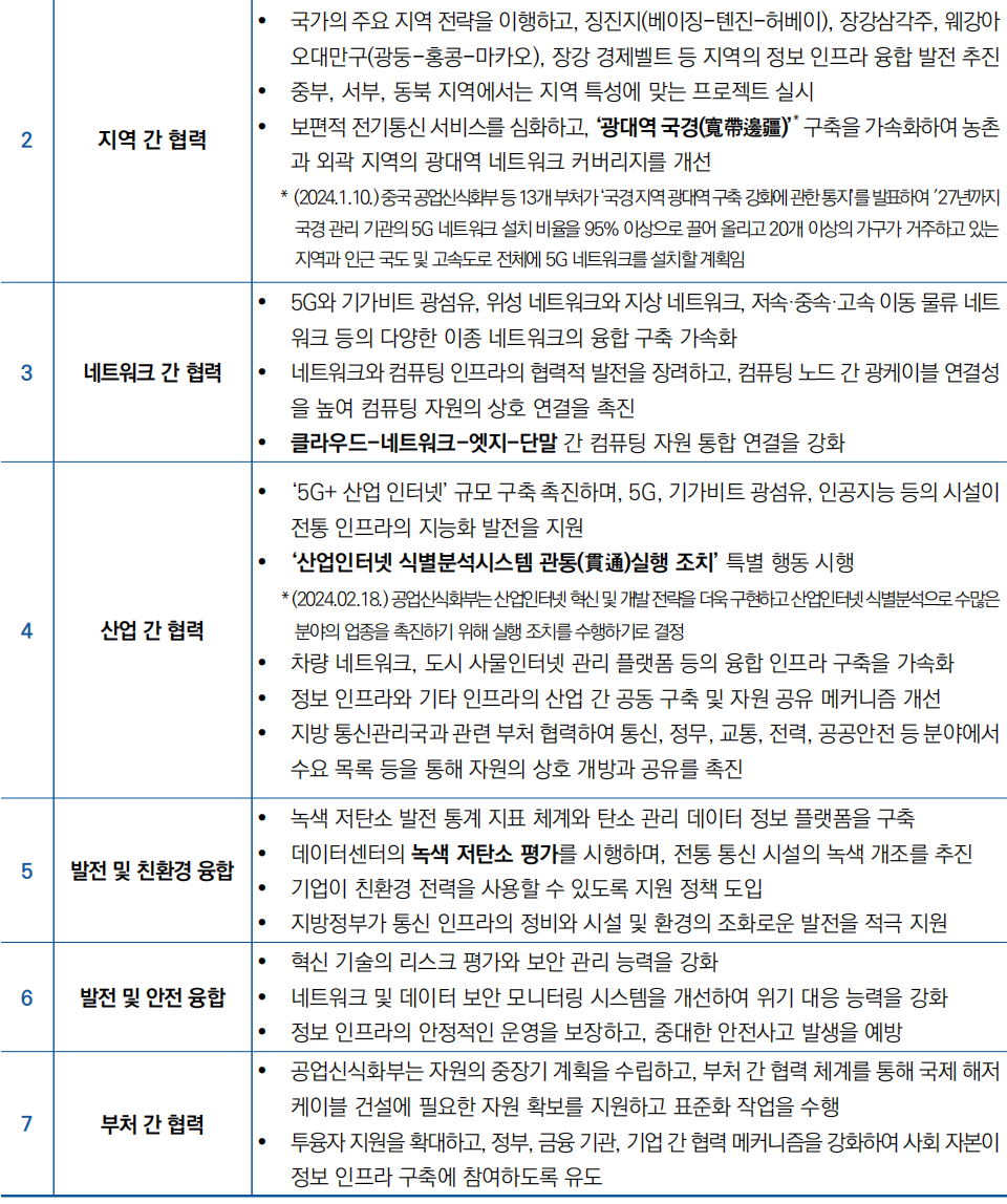 ![]() ○ (내용) 신형 정보 인프라의 지역 간, 네트워크 간, 산업 간 협력 구축을 중점 방향으로 제시하고, ‘1통합 6협력(1統籌 6協調)’이라는 7대 중점 업무를 제안