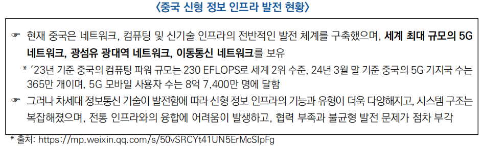 □ 공업신식화부 등 11개 부서는 신형 정보 인프라의 발전을 촉진하기 위해 ‘신형 정보 인프라의 조화로운 발전 촉진에 관한 통지’를 발표(24.9.4)