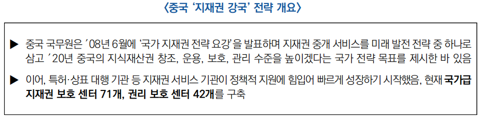 ![]() - 중국은 ‘14차 5개년 규획’에서 강조한 바와 같이 ‘지재권 강국’ 전략 이행을 위해 ′21년 지재권 강국건설의 청사진 발표부터 각종 지침 및 법령 등을 잇따라 발표